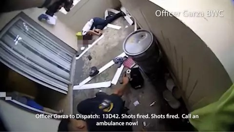 One shot can be heard in the video immediately before Maldonado fired four times at Benitez-Vasquez, who was struggling with Garza on the floor. Garza, whose firearm was fired once according to police, was not hit by any of the five shots fired.