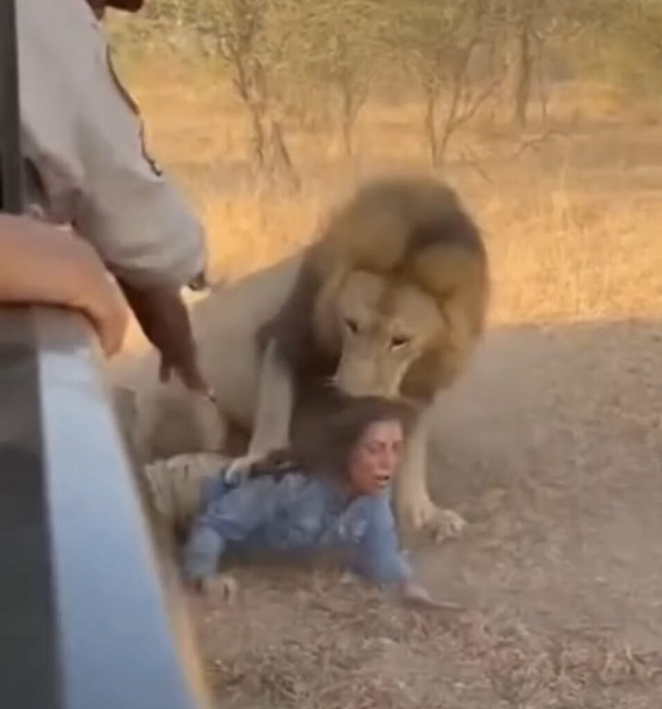But she apparently didn’t notice that one of the lions was approaching the vehicle from the side.